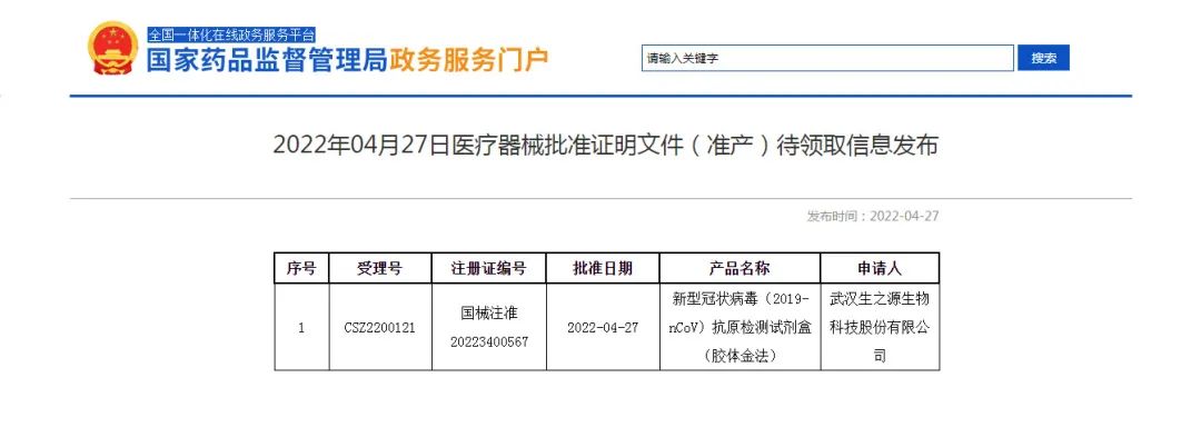 4月27日,武漢生之源生物科技股份有限公司研制的新型冠狀病毒(2019-nCoV)抗原檢測試劑盒(膠體金法)產(chǎn)品獲國家藥監(jiān)局批準上市,是國內(nèi)第30家新冠抗原試劑獲批的企業(yè)。