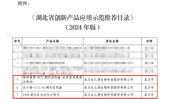 根據《湖北省創新產品應用示范實施方案》,列入目錄的創新產品,可直接列入《 湖北省節能環保技術 (產品)推薦目錄》,積極推薦進入 《 國家基本醫療保險、工傷保險和生育保險藥品目錄》備選名單,優先推薦列入國家《首臺(套)重大技術裝備推廣應用指導目錄》等。武漢生之源生物有3個產品入選,分別是降鈣素原(PCT)測定試劑盒、白介素6(IL-6)測定試劑盒、全自動生化免疫分析儀(SZY-BA2000)。