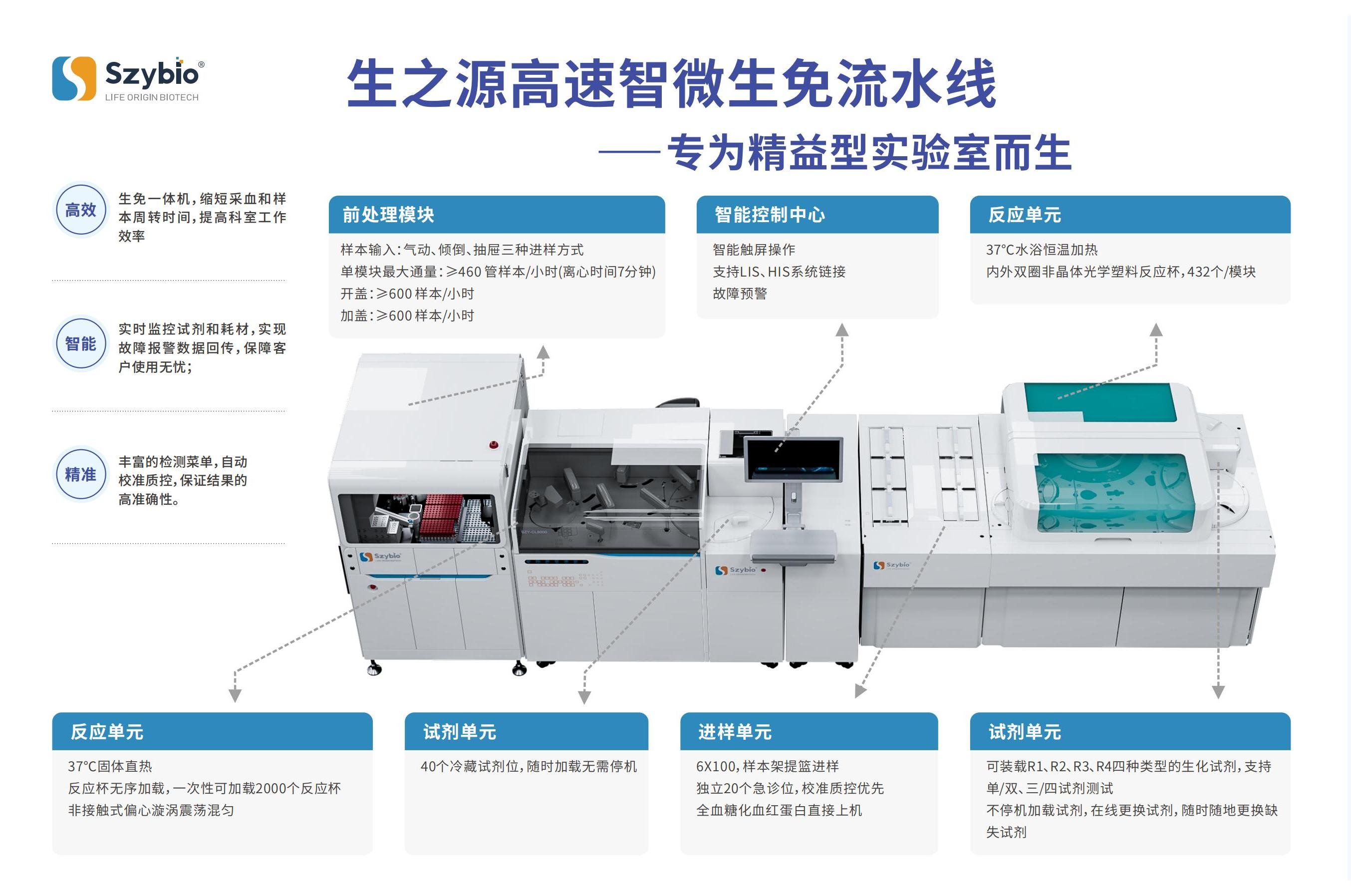 生之源高速極簡生免流水線配備20個獨立急診通道與600個樣本位,支持血清、尿液等多類型樣本批量處理;全流程自動化管理實現24小時不間斷運行,試劑針具備智能保護功能,內置完善質控體系,確保檢測高效精準。前處理模塊每小時處理≥600樣本,智能控制中心支持LIS/HIS系統連接與故障預警,40個冷藏試劑位支持不停機加載,37℃恒溫反應單元保障高效檢測,顯著提升實驗室工作效率。